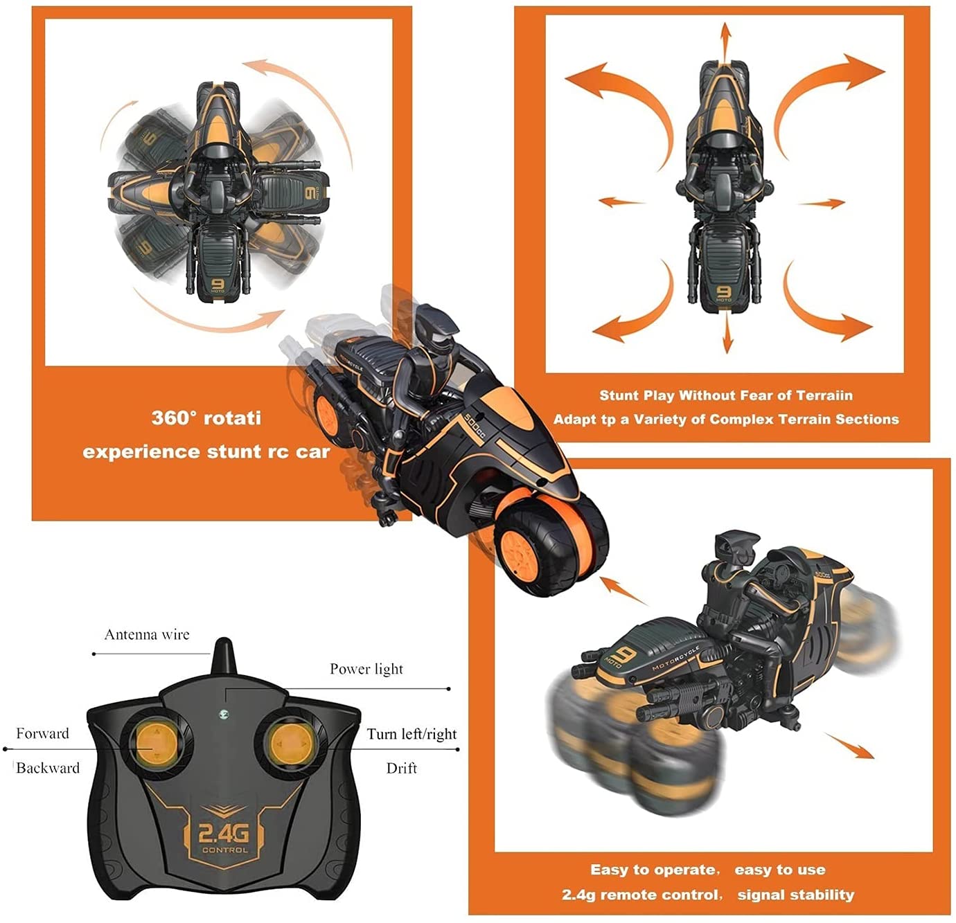 *This rc motorcycle is operated by moving the remote control back and forth, and it can also be rotated left and right.