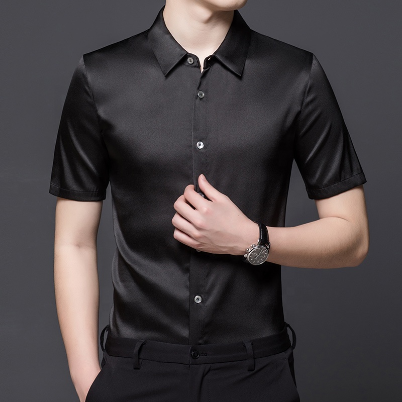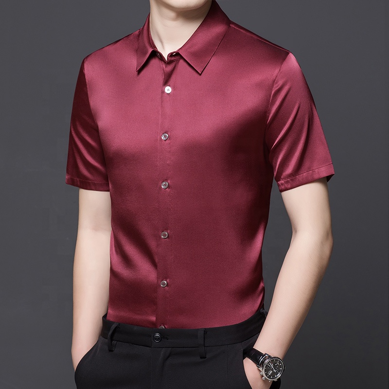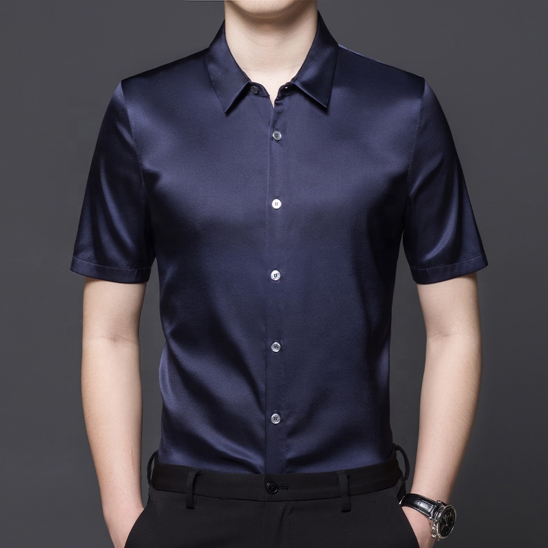 2023 High Quality Business Stand Collar Silk Shirt For Men Solid Color 90.4% Silk Short Sleeve Men's Shirt