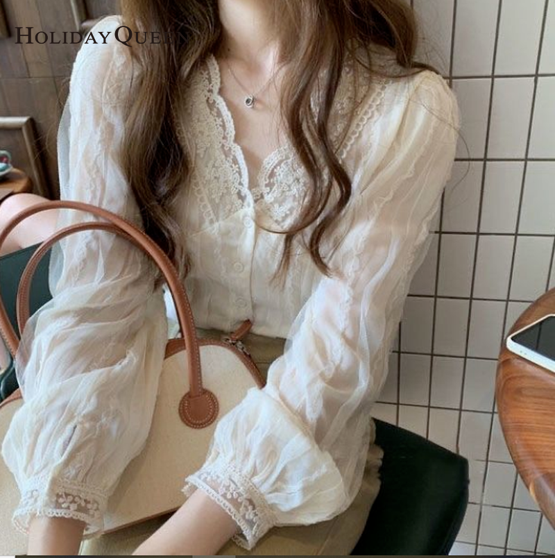 HolidayQueen Women's Autumn Wear V-neck Long-sleeved French Temperament Gentle Chiffon Shirt Sweet and Chic Small Shirt Fashionable All-match Blouse S M L XL 2XL Free Shipping HQ0564