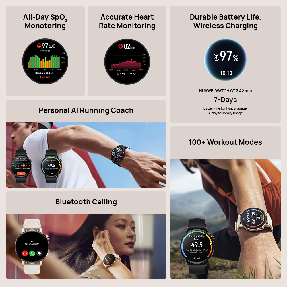【Durable Battery Life】On afull charge, HUAWEI WATCH GT 3 42 mm lasts up to 7 days, so you're fullyprepared to keep track of your every workout and not miss out on any healthcheck. It supports wireless charging, so you can use your phone to reversecharge it when you forget your charger and say goodbye to battery life anxiety.