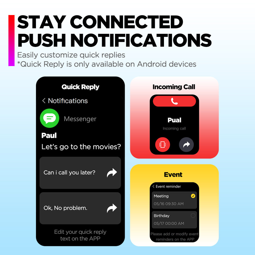 Smart Notifications(Call, Text, Gmail and Smartphone App Notifications), Customize Quick Reply(*Quick Reply is only available on Android devices), Weather Sync(Check weather in the next four days) , Flashlight, Controls Smartphone Music and Camera, Raise to Wake, Find My Phone and Watch, Do Not Disturb Modes, Sedentary alert, Drink Water Reminder, Medication Reminder, Overide Screen to Turn it Off.