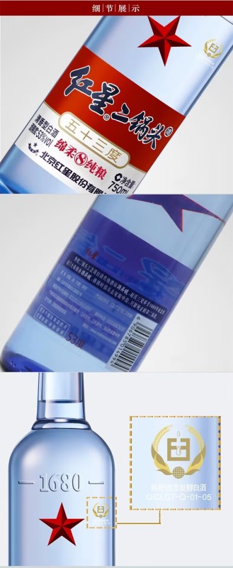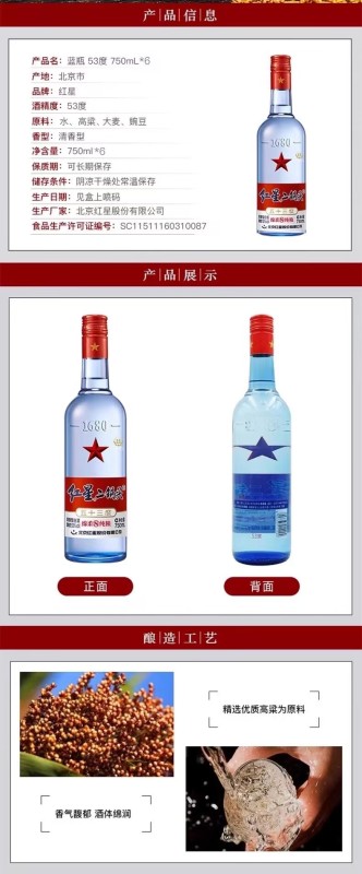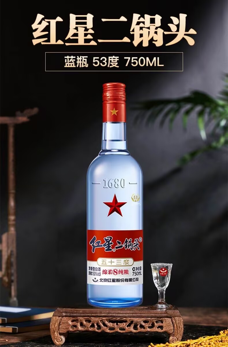 Red Star Erguotou Blue Bottle Mianrou 8 Pure Grain 53 degrees 750ml*6 bottles full case of Fen-flavor liquor grain ration wine